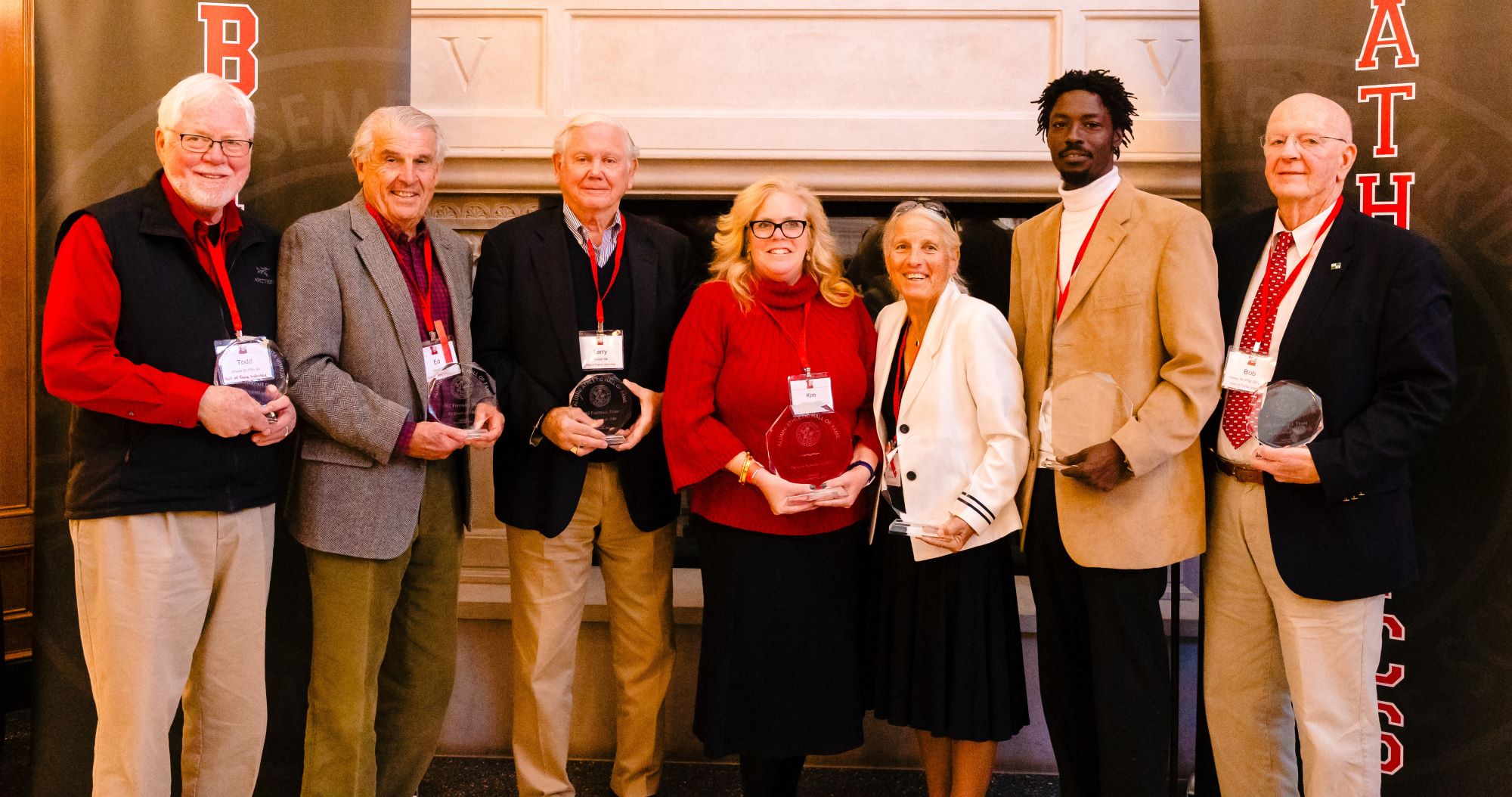 Todd Orvald ’63 P’89 ’95, Ed Dimon ’63, Larry Tondel ’64, Kim Newsome P’15, Melissa Magee Speidel P’10 ’12, Aaron David Whitehurst Jr. ’04, and Bob Casey ’63 P’92 GP’21 ’24 accepted plaques signifying induction into the Athletic Hall of Fame in November. Orvald, Dimon, Tondel, and Casey represented the 1962 football team; Newsome accepted on behalf of her son, Grant Newsome ’15.